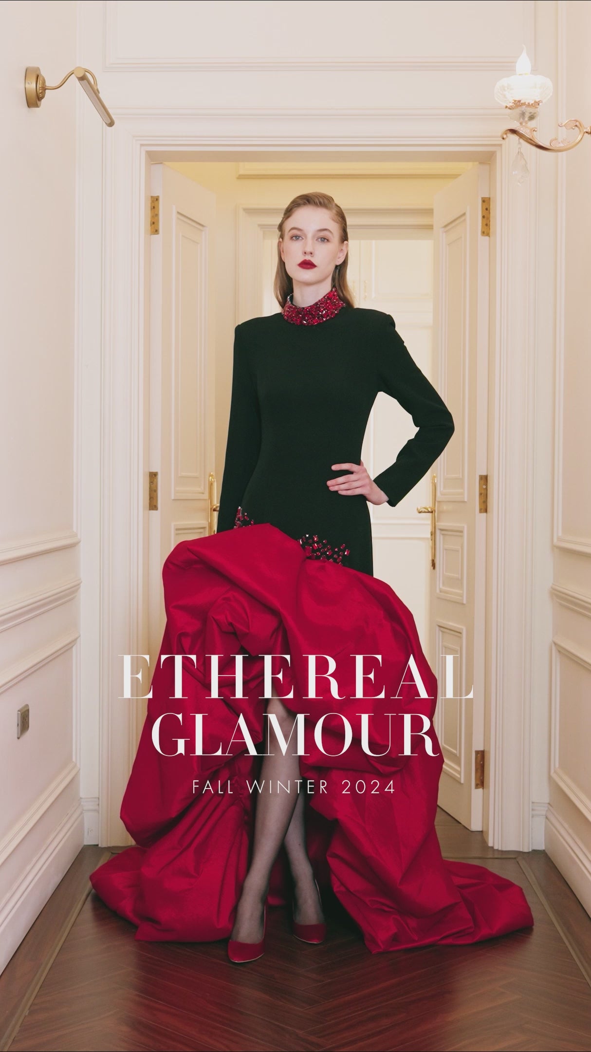 استوحى المصممون في IHF هذا الفستان من الوردة الساحرة، وحولوه إلى تحفة فنية فريدة من نوعها. فالياقة العالية المزينة بأحجار لامعة والأكمام الطويلة تخلقان صورة ظلية قوية ومنظمة تشع بالقوة والأناقة. ويعزز ذيل الفستان المصنوع من قماش التفتا، المصمم ليتألق وينتفخ بلطف مثل الوردة المتفتحة في الليل، جاذبية الفستان الأنثوية. وبفضل زواياه المذهلة وسحره الذي لا يمكن إنكاره، يحول هذا الفستان أي امرأة ترتديه إلى حضور آسر لا يقاوم.