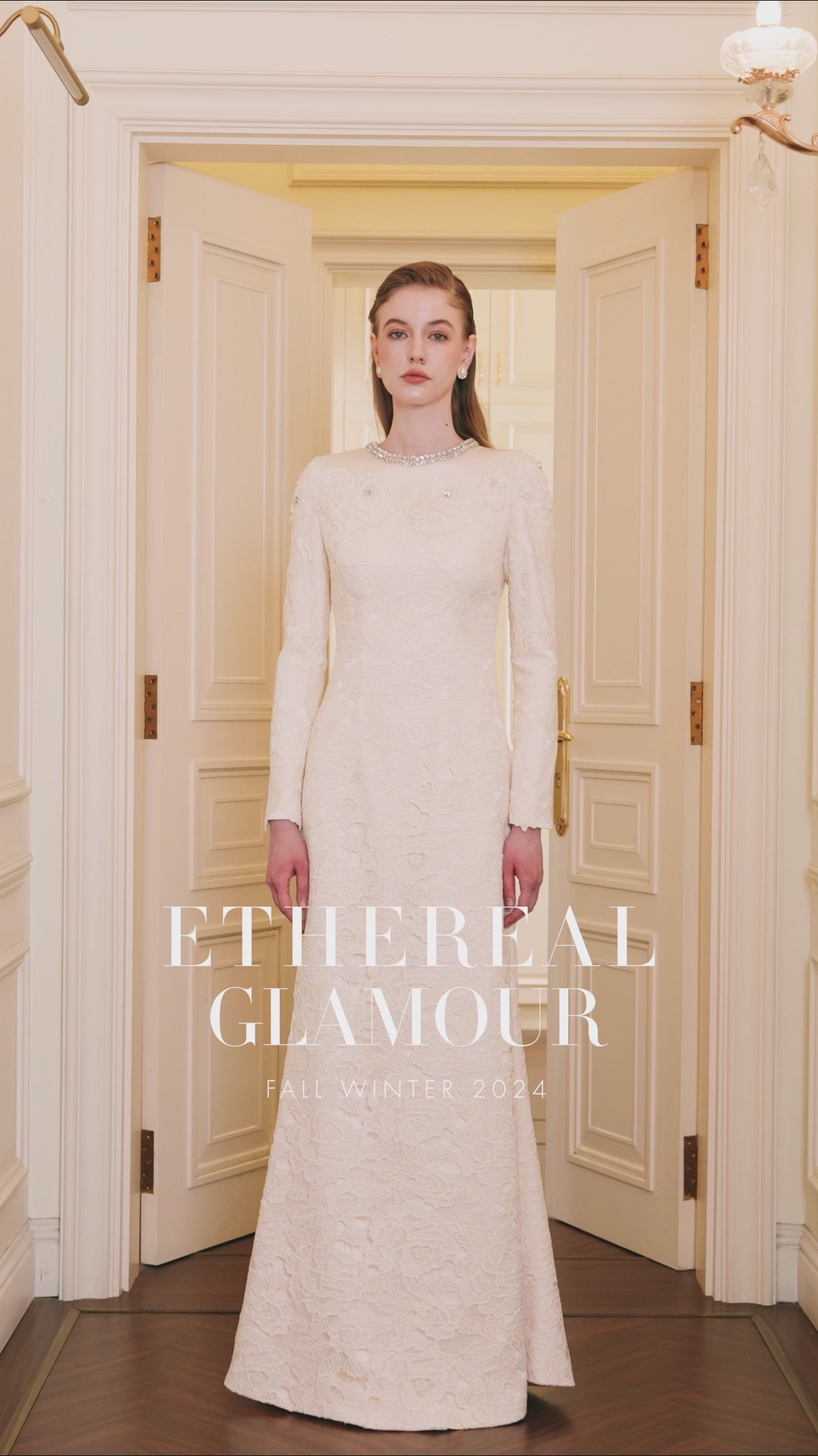 يُعد الفستان الأبيض الذي يشبه حورية البحر من بين أفضل الصفات التي يمكن أن نوصف بها هذا الفستان، فهو لا يتسم بالإسراف ولا المبالغة، فهو يتميز بذيل أنيق وواسع بشكل رقيق وأكمام طويلة ومتواضعة. كما يبرز تطريز الدانتيل الوردي بشكل جميل على الحرير العاجي، مما يضيف عمقًا وملمسًا إلى الفستان. كما يعزز خط العنق المستدير المزين بالكريستال من بريقه ورقيه، مما يضفي لمسة من التألق والأناقة.