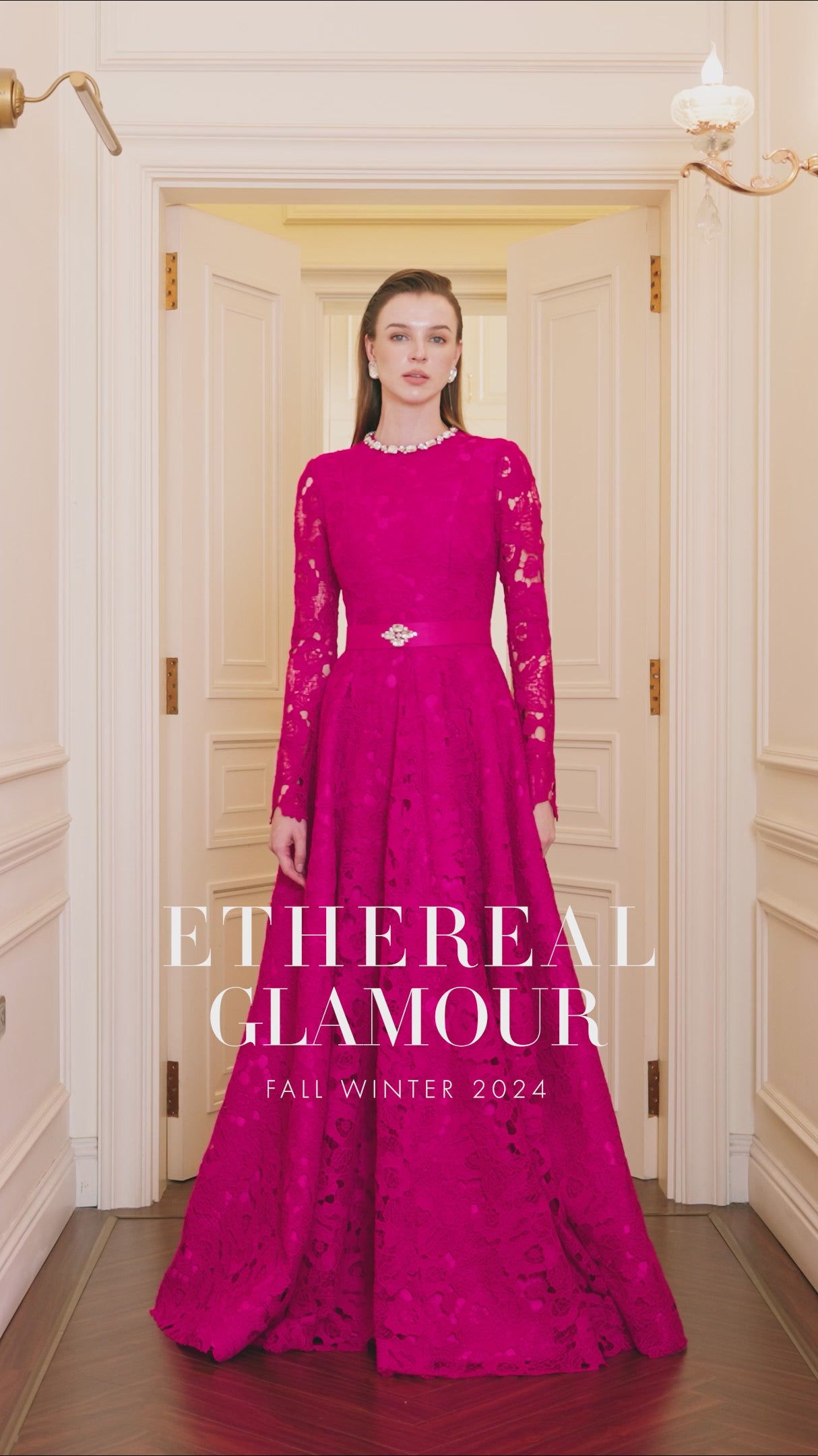 يجسد هذا التصميم، الذي يتألق بسحر اللون الوردي الفوشيا، جوهر الأناقة والمرح. يحيط خط العنق المستدير المزين بالكريستالات المتلألئة الوجه بتوهج مشع، بينما تتدفق الأكمام الطويلة في تنورة نصف دائرية ترقص برشاقة مع كل خطوة. تعمل الزخارف البراقة على خط العنق والحزام على رفع القطعة وتحويلها إلى احتفال بالجمال الشبابي والسحر الخالد.