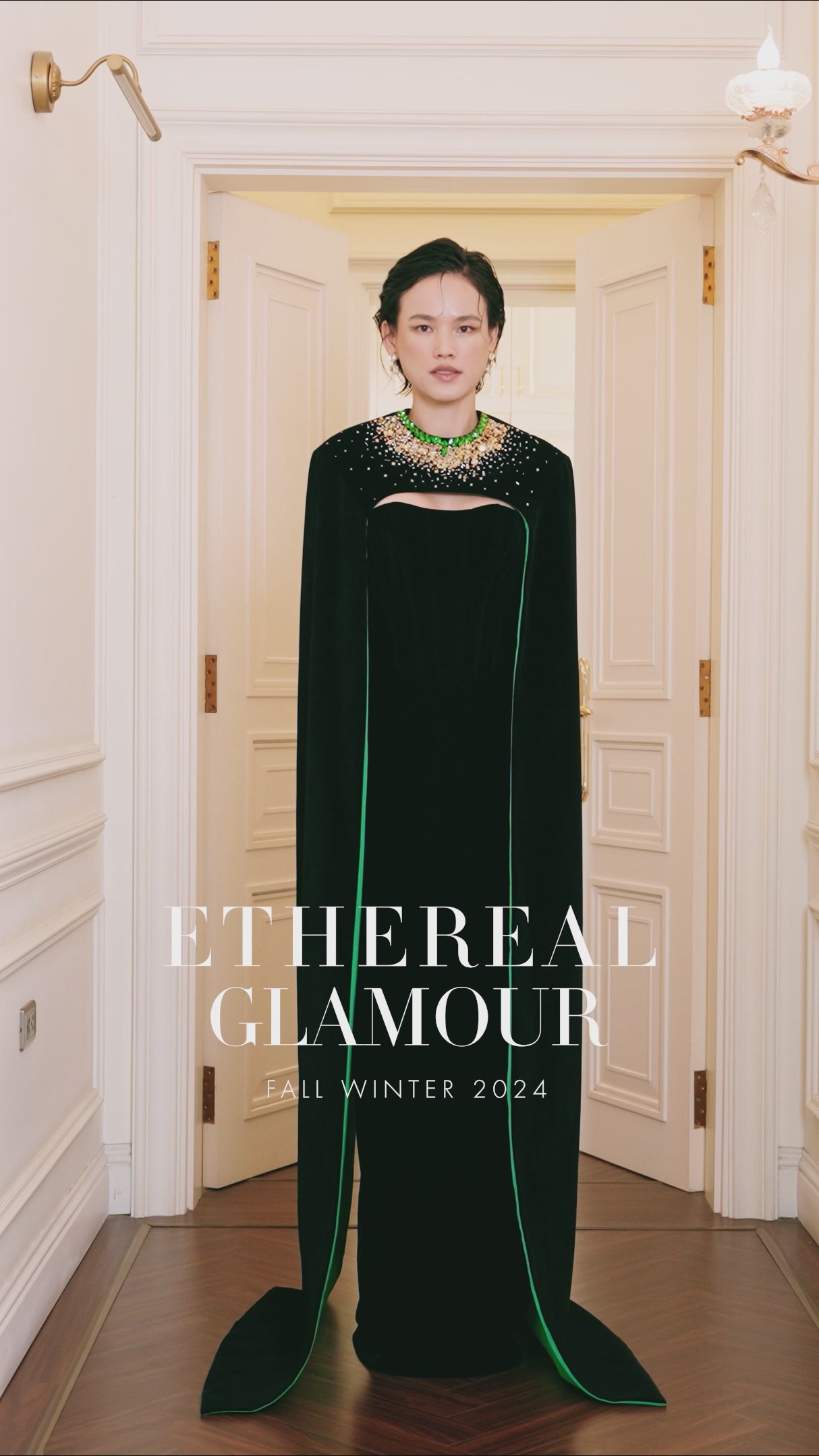 صُنع هذا الفستان من المخمل الأسود الناعم، ويوفر شعورًا بالراحة دون التنازل عن روعته الفاخرة. يتميز الفستان بعباءة طويلة مع بطانة رقيقة باللون الأخضر الياقوتي، مما يعزز أناقة تصميمه. وأكثر ما يلفت الانتباه هو خط العنق، المزين بأحجار كريمة موضوعة بعناية تشكل طوقًا لامعًا، بمثابة نقطة محورية آسرة للفستان.