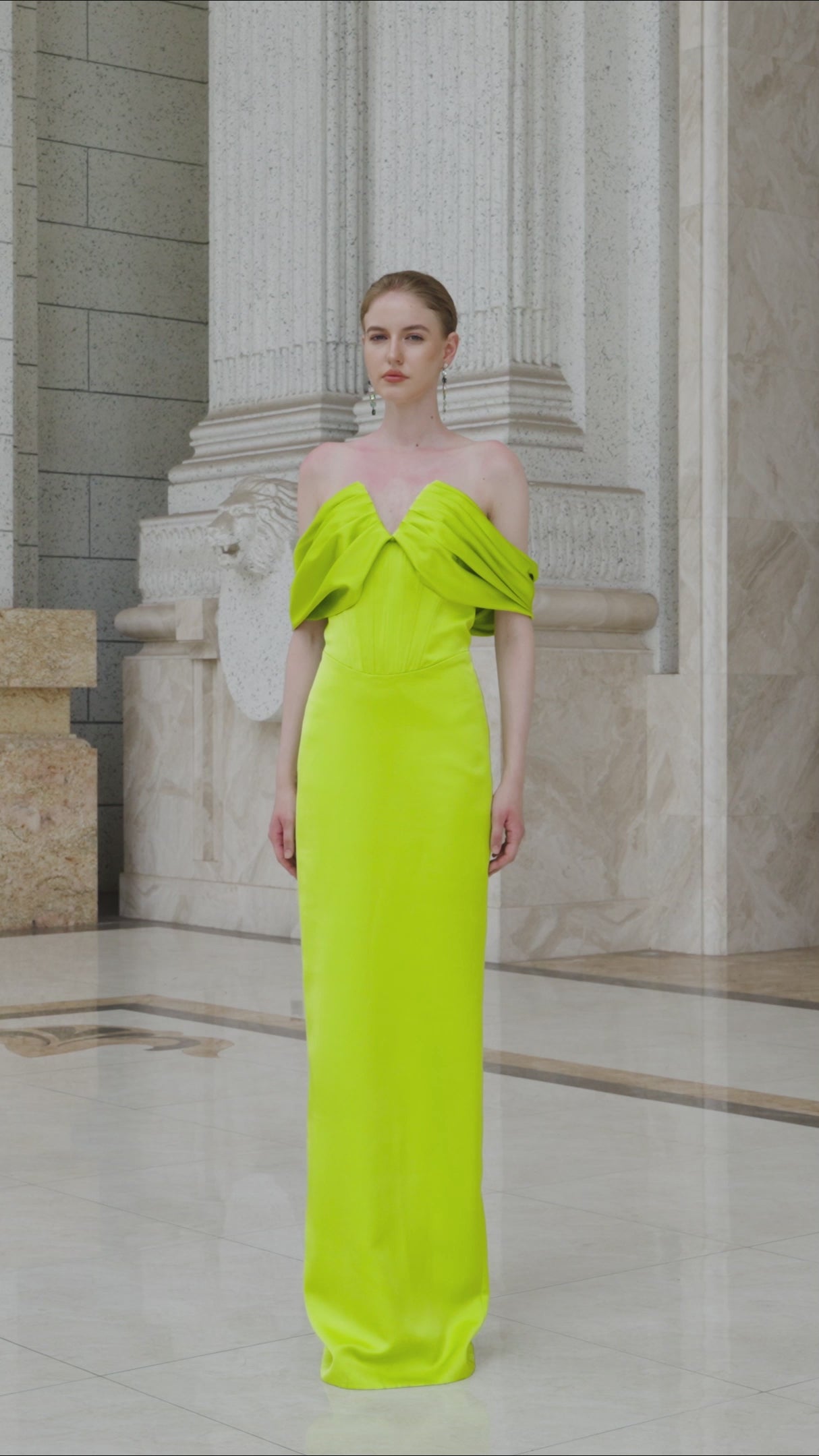 فستان مكشوف الأكتاف بأكمام مطوية وفتحة على شكل حرف V في الأمام، يأتي مع حرير العقيق بالكامل