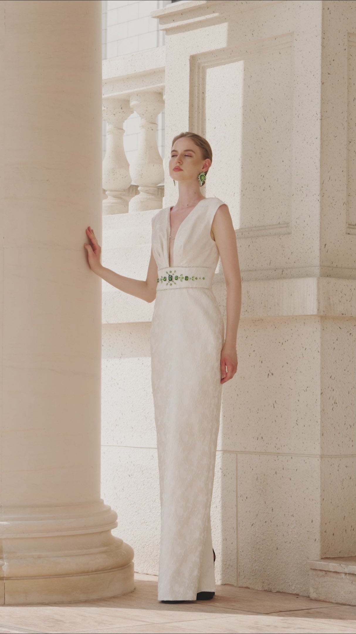 فستان طويل يصل إلى الأرض بتصميم عمودي مع فتحة صدر على شكل حرف V وخصر مزخرف، يأتي من مادة تصميم أكانثوس بيضاء منسوجة بتقنية الجاكار.