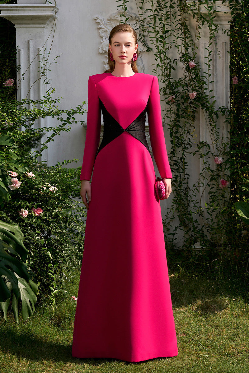 Inspired by European royal style, this A-Line evening gown exudes both strength and allure, embodying elegance and sophistication. Black details on either side of the waist are shaped to mimic a classic corset, creating a cinched effect that accentuates sharp, graceful curves. The structured shoulders add a sense of power, while the fuchsia pink maintains a touch of femininity. This design offers a unique blend of classic and contemporary style, radiating an undeniable confidence and allure MATERIAL Crepe & Shimmer Silk (Silk lined) NOTE - Perfect for the following occasions: Evening Galas, Formal Events - Price does not include accessories - Dry clean only and store separately - Made in Vietnam |