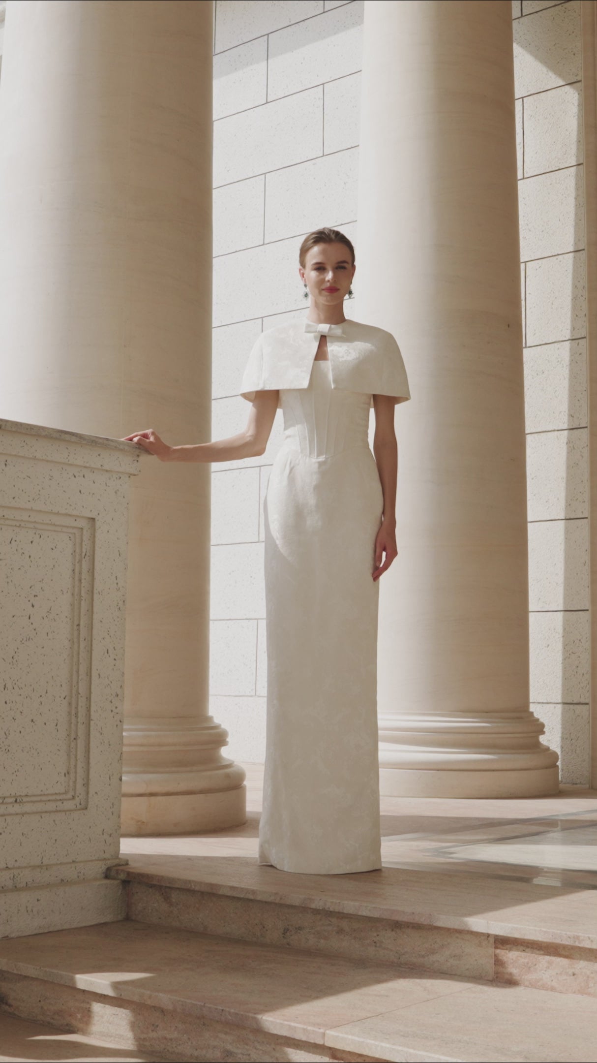 The Column Gown with Bustier Bodice and Attachable Mini Cape blends structured elegance with a modern bridal twist. Crafted from semi-thick rose-patterned brocade, the fitted bustier bodice sculpts a flattering silhouette, while the detachable mini cape adds a playful yet sophisticated accent. This design offers versatility and charm for brides seeking a distinctive look. MATERIAL Rose Design Brocade NOTE - Perfect for the following occasions: Wedding Receptions, Private Parties - Price does not include accessories - Dry clean only and store separately - Made in Vietnam |
