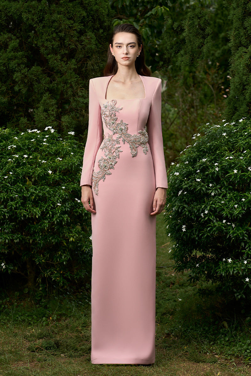 In a soft pastel pink, this column evening gown exudes timeless sophistication and understated glamour. The trapeze neckline, paired with long sleeves, strikes a harmonious balance between modern minimalism and refined elegance. Intricate hand-embroidered floral motifs cascade gracefully across the bodice and waist, evoking the charm of royal gardens and adding depth to the gown’s sleek silhouette. Perfectly tailored to highlight the wearer’s natural grace, this gown is a flawless choice for any occasion that calls for poise and class MATERIAL Crepe NOTE - Perfect for the following occasions: Wedding Receptions, Formal Events - Price does not include accessories - Dry clean only and store separately - Made in Vietnam |