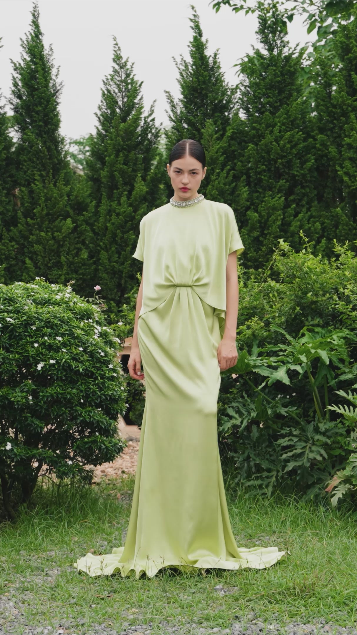 The High-Neck Mullet Gown with Rhinestones in Japanese Silk is a striking blend of refinement and modern allure. Featuring a high neckline and a distinctive mullet hemline, the gown gathers softly at the waist to create a graceful, flattering shape. Sparkling rhinestone embellishments catch the light with every movement, while the luxurious Japanese silk base brings a sense of understated opulence to the design. MATERIAL Japanese Silk NOTE - Perfect for the following occasions: Wedding Receptions, Private Parties - Price does not include accessories - Dry clean only and store separately - Made in Vietnam |