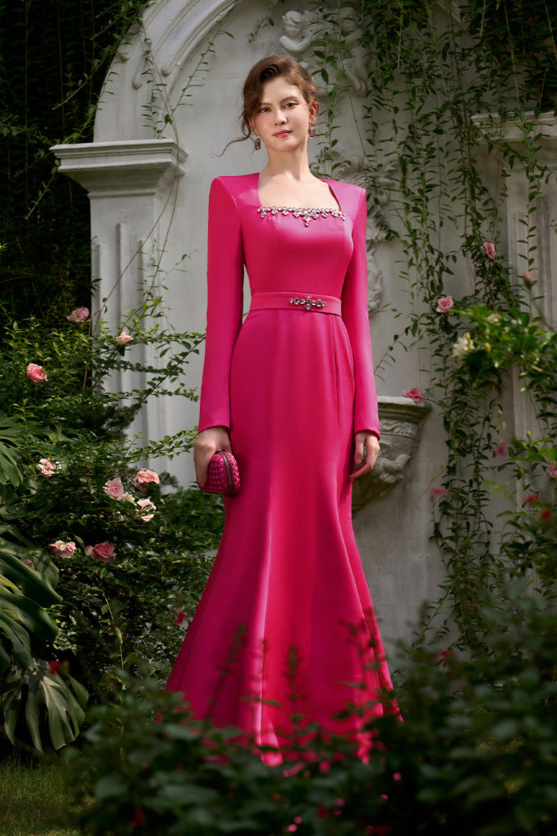 This mermaid evening gown in a captivating light pink hue evokes the image of blooming flowers in a royal English garden. The trapeze neckline, adorned with sparkling gemstones reminiscent of starlit skies, adds an elegant and regal touch. The sleek, body-hugging silhouette accentuates graceful curves, while the long sleeves provide a modern sense of sophistication. Each step in this design feels immersed in opulence, leaving an unforgettable impression MATERIAL Crepe (Silk lined) NOTE - Perfect for the following occasions: Evening Galas, Formal Events - Price does not include accessories - Dry clean only and store separately - Made in Vietnam |