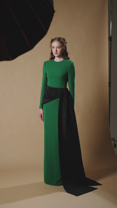 Round Neck Column Gown With Asymmetric Draped Detail In Green Crepe & Black Taffeta Sale price$1,035 USD