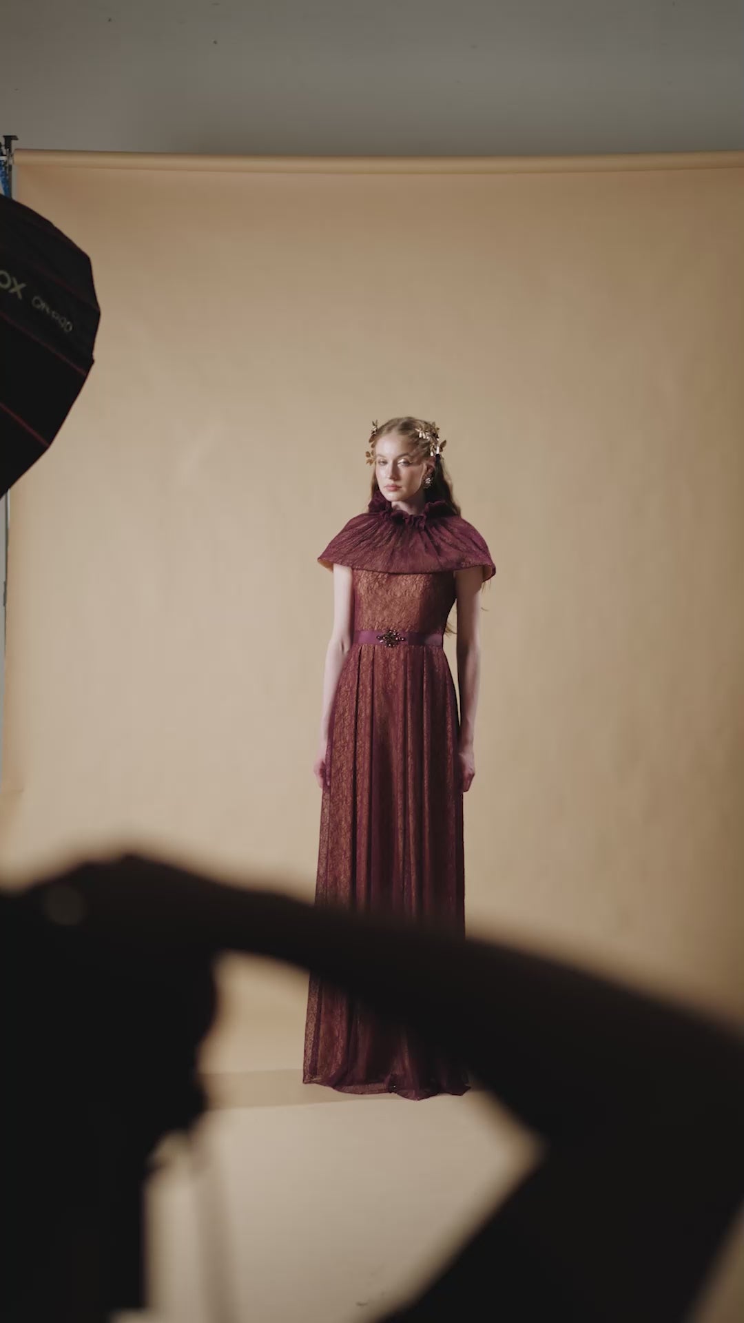 The A-line Gown with Mini Cape in Dark Red Vine Guipure Lace presents a refined silhouette infused with classic allure. Tailored from delicate vine-patterned lace in a deep burgundy hue, the gown skims the figure before flowing into a soft A-line hem. The stand collar and sculpted mini cape add architectural balance, while a tonal waistband cinched with a jeweled brooch highlights the waist. Slight elasticity ensures a comfortable, form-fitting drape that moves gracefully with the wearer MATERIAL Vine Guipure Lace NOTE - Perfect for the following occasions: Wedding Receptions, Private Parties - Price does not include accessories - Dry clean only and store separately - Made in Vietnam |
