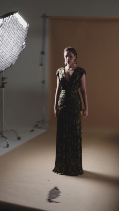 An elegant black gown crafted from metallic striped chiffon, blending timeless sophistication with a touch of modern allure. The soft A-line silhouette flows gracefully with every step, while the deep V-neckline accentuates femininity and confidence. Waist draped details subtly highlight the figure, creating a harmonious balance between structure and fluidity. This gown embodies the essence of refined glamour classic yet effortlessly captivating. MATERIAL: Metallic Striped Chiffon NOTE - Perfect for the following occasions: Evening Galas, Private Parties - Price does not include accessories - Dry clean only and store separately - Made in Vietnam |