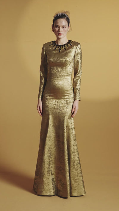 This Yellow Floor-Length Trapeze Neckline Column Gown combines timeless elegance with modern sophistication. Crafted from luxurious Metalic Jacquard, it features long sleeves and a flattering silhouette. The Taffeta waist belt with a mini bow adds a charming touch, enhancing the gown’s graceful design. Perfect for an evening of refined beauty, this gown exudes opulence and effortless style. MATERIAL Metallic Silk (Silk lined) NOTE - Perfect for the following occasions: Evening Galas, Formal Events - Price does not include accessories - Dry clean only and store separately - Made in Vietnam |