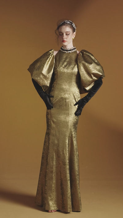Elegant and striking, this Dark Gold Floor-Length Bottle Neck Mermaid Gown is crafted from luxurious Metalic Silk. The puff sleeves add a bold, dramatic flair, while crystals and stones embellish the neckline, offering a touch of refined sparkle. Perfect for an evening of sophistication, this gown combines timeless beauty with modern elegance. MATERIAL Metallic Silk (Silk lined) NOTE - Perfect for the following occasions: Evening Galas, Events - Price does not include accessories - Dry clean only and store separately - Made in Vietnam |